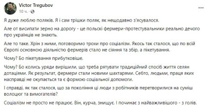 Співзасновник партії "Демократична Сокира" заявив, що любить поляків, але констатує, що, мабуть, поляки, "дечого знають про українців". Також він назвав фермерів "волоцюгами та здирниками".