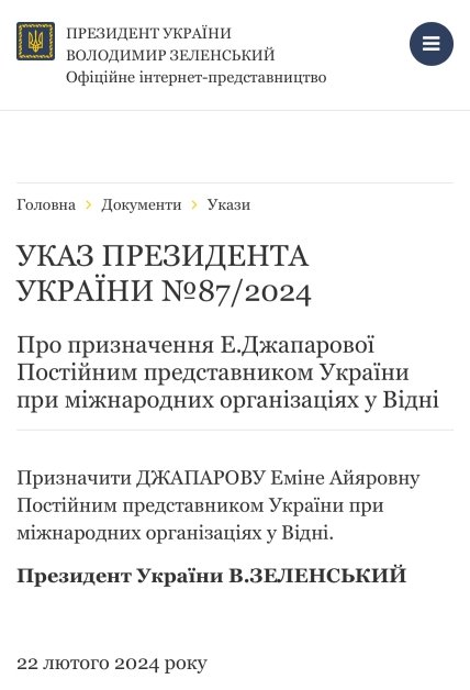 Указ про призначення №87/2024 уже підписано президентом. Еміне Джапарова на своїй сторінці у соцмережі вже відреагувала на нову посаду.
