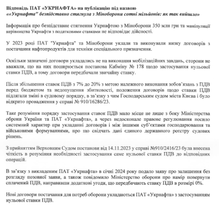 "У 2023 році ПАТ "Укрнафта" та Міноборони уклали та виконували низку договорів з постачання нафтопродуктів для техніки спеціального призначення. Оскільки зазначені договори укладались не на виконання мобілізаційних завдань, сторони не вважали, шо на них поширюється постанова Кабміну №178 щодо застосування нульової ставки ПДВ, а тому договори передбачали звичайну ставку.