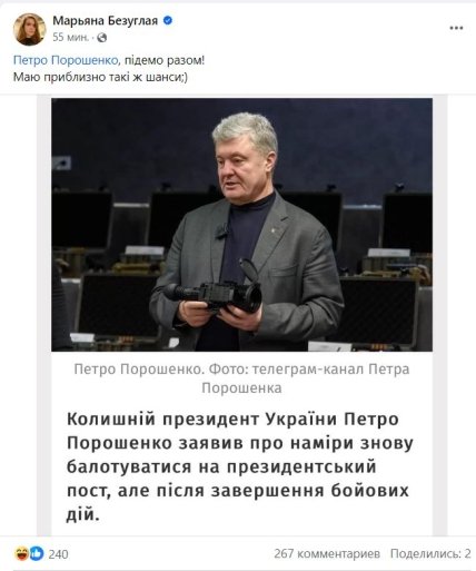 При цьому користувачі мережі заяву Безуглої сприйняли неоднозначно, оскільки в коментарях знайшлися як прихильники Порошенка, так і затяті противники. Дехто висловив припущення, що п’ятий президент має непогані шанси стати сьомим, а інші поцікавилися, як бажання Безуглої буде сприйнято на Банковій.