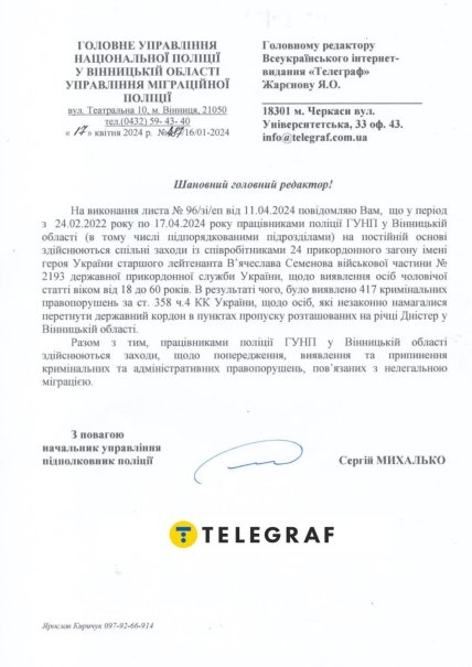 "Було виявлено 417 кримінальних правопорушень за ст. 358 Кримінального Кодексу України щодо осіб, які незаконно намагалися перетнути державний кордон у пунктах пропуску, розташованих на річці Дністер у Вінницькій області", — йдеться у повідомленні.