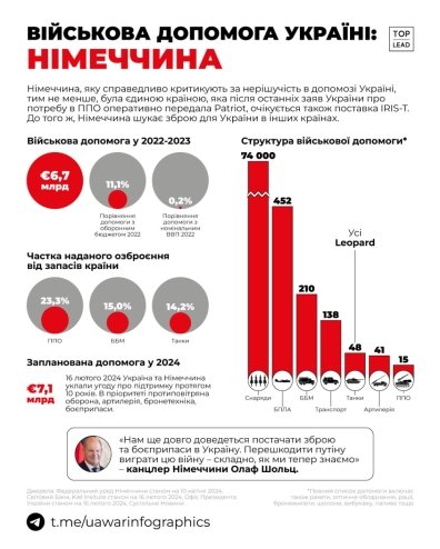 Варто зазначити, що 16 лютого 2024 Україна та Німеччина уклали угоду про підтримку протягом 10 років. В пріоритеті протиповітряна оборона, артилерія, бронетехніка, боєприпаси. За словами Канцлера Німеччини, на цей рік у бюджеті ФРН передбачено понад 7 млрд євро на військову допомогу Україні.