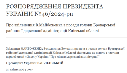 У п'ятницю, 26 квітня, п'яний голова Броварської районної державної адміністрації Володимир Майбоженко влаштував ДТП. І вже наступного дня президент України Володимир Зеленський звільнив його з посади.