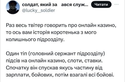 Зокрема, на проблему ігроманії звертали увагу народний депутат Олексій Гончаренко та солдат аерозвідник 59-ої бригади Павло Петриченко. Історію останнього прикріпляємо у скрінах.