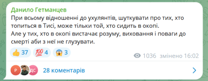Народний депутат України Данило Гетманцев засудив цей жарт. Він написав, що так шуткувати може лише той, хто знаходиться в окопі.