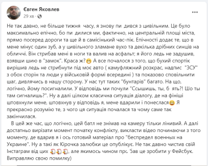 "Все почалося з того, що бухий спортік вирішив ледь не стрибнути під моє авто (камуфляжний розкрас, надпис "ЗСУ" з обох сторін та люди у військовій формі всередині) та показово сповільнити крок, дивлячись в нашу сторону. У нас тут таких "бунтарів" багато. На що, логічно, йому посигналили. У відповідь ми почули "Ссишиш, ти, б**ть?! Шо ти там сигналиш?". Ну а далі цілком класична ситуація діалогу, де на фініші штовхнули мене, штовхнув у відповідь я, мене вдарили і понеслася. Я прекрасно розумію те, з чого ця ситуація почалася та чому саме так закінчилася", ― написав Яковлев.