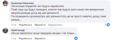 Як бачимо з коментарів, деякі користувачі мережі висловлюються за "діловий підхід" до ситуації. Пропозиція легалізувати "інтимний бізнес" зустрічається доволі часто. Варто зауважити, що в українському інформаційному просторі, час від часу, зринають пропозиції легалізувати проституцію, проте до конкретних дій це поки не дійшло.