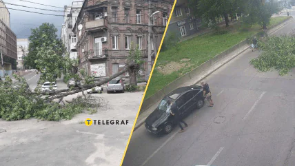 На одній з вулиць дерево впало прямо на проїжджу частину тоді, коли по ній рухалася автівка. Припарковану на узбіччі машину теж зачепило.