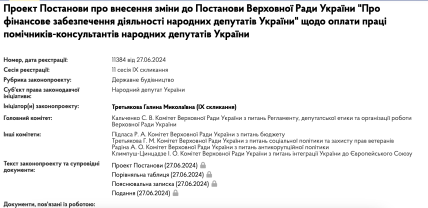До вищевказаного проєкту постанови прикріплена пояснювальна записка, у якій вказано, що народний депутат може мати до 31 помічника-консультанта. Але фонд оплати праці на всіх помічників-консультантів, які працюють за строковим трудовим договором становить 88,4 тисячі грн на місяць у 2024 році.