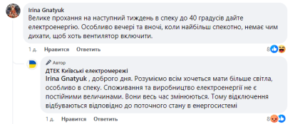 "Велике прохання на наступний тиждень в спеку до 40 градусів дайте електроенергію. Особливо ввечері та вночі, коли найбільш спекотно, немає чим дихати, щоб хоть вентилятор включити", — написала користувачка.
