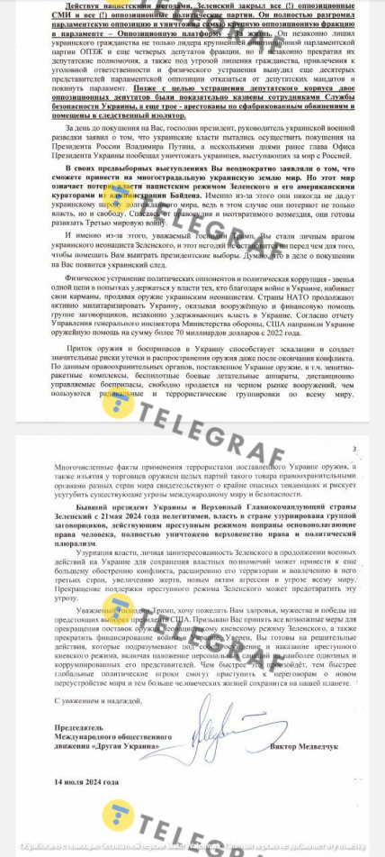 Божевільні фантазії вкупі з російською пропагандою: "Телеграф" отримав копію листа Медведчука до Трампа, деталі