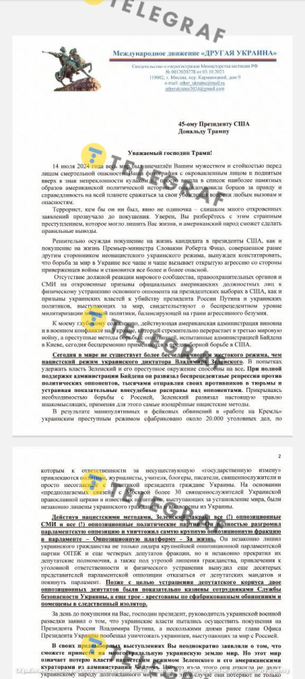 Окремої уваги у листі заслуговує абзац про те, що на думку кума Путіна, Трамп став "особистим ворогом українського неонациста Зеленського" і "цей негідник не зупиниться ні перед чим для того, щоб завадити виграти президентські вибори".