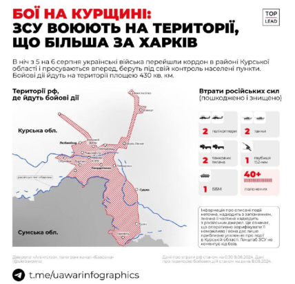 За даними UA War Infographics, 430 кв. км — зона бойових дій у Курській області сьогодні. Це більше, ніж місто Харків. Близько 20 населених пунктів вже під контролем України повністю чи частково.