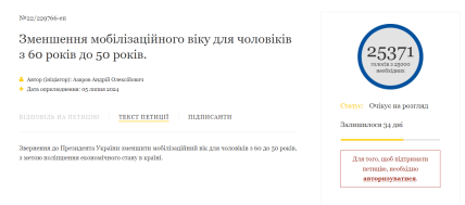 Петиція про зменшення мобілізаційного віку до 50 років набрала необхідну кількість голосів. Тепер її має розглянути президент України Володимир Зеленський.