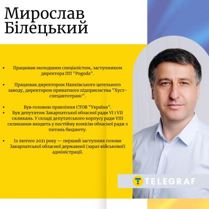 - Мирослав Білецький. Нині він перший заступник голови обласної державної адміністрації Закарпаття.