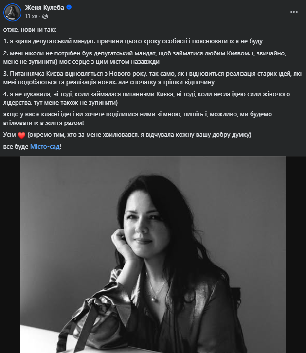 - Євгенія Кулеба залишає Київраду після кількох років роботи депутатом