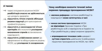 Й здається суспільний резонанс, викликаний викриттям системних порушень й зловживань в системі медико-соціальної експертизи, та критика процедуру з боку цивільних та військових, а також активність громадських організацій, що відстоюють їхні права, таки мають результат. Або так просто співпало, що на хвилі скандалу МОЗ оприлюднив законопроєкт, що має докорінно оновити систему. У відомстві пропонують відмовитися навіть від назви медико-соціальна експертиза, замінивши його на "оцінювання повсякденного функціонування людини", покращити кадровий склад комісій, провести цифровізацію тощо. Протягом 30 днів у міністерстві приймаються пропозиції та зауваження щодо запропонованого документу.