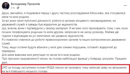 "За посаду заступника голови КМДА ніколи не тримався, тому написав заяву на звільнення на імʼя Київського міського голови.", — заявив Прокопів.