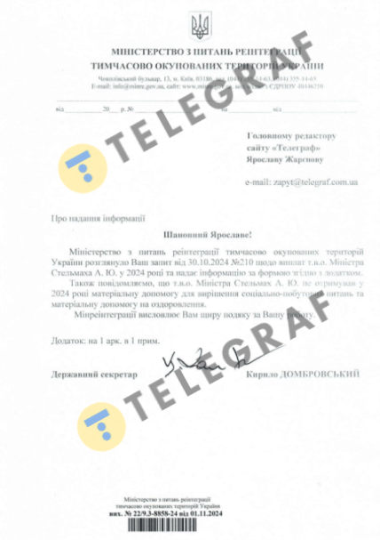 Загальна сума виплат Стельмаху за два місяці роботи склала 144418 гривень. У відповіді на інформаційний запит Міністерство з питань реінтеграції тимчасово окупованих територій додало, що т.в.о. міністра Стельмах у 2024 році не отримував матеріальної допомоги для вирішення соціально-побутових питань. Також відомство повідомило про відсутність виплат на оздоровлення.