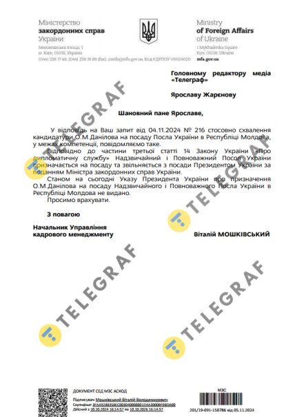 Також у міністерстві наголосили, що станом на 5 листопада указу президента про призначення Данілова на посаду посла України в Республіці Молдова не видано. У МЗС попросили врахувати цю інформацію.