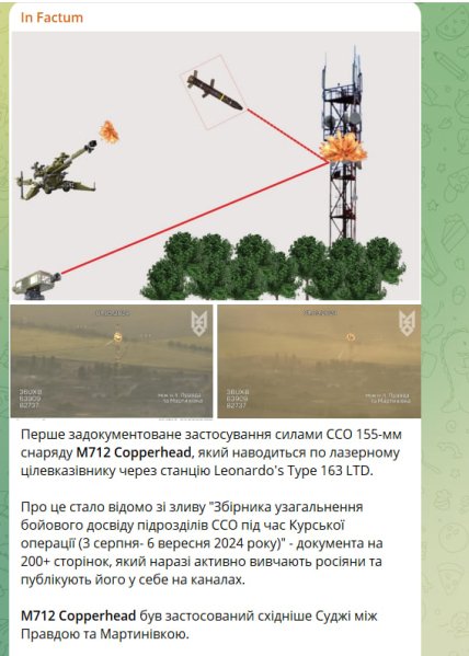 "Зазначається, що керований снаряд M712 Copperhead був застосований для ураження металевої вежі зв’язку на схід від Суджі, всього на мету було витрачено три такі керовані снаряди. Стрільба такими снарядами велася з гаубиці M777", — йдеться в повідомленні.