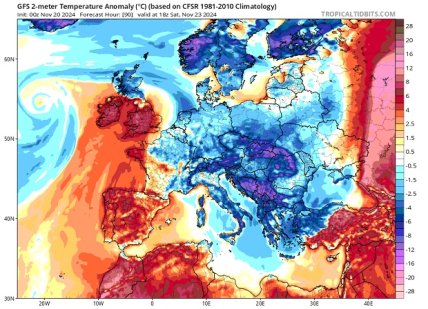 Таким чином, погода у третій декаді листопада буде вкрай нестійкою, з різкими коливаннями атмосферного тиску, поривчастим вітром та сильними опадами. Також температура повітря помітно знизиться не лише в Україні, а й у більшості інших європейських країн. Це можна побачити на прогностичній карті аномалій температури повітря, де синім кольором показана область з негативною аномалією (в даному випадку, для вечора 23 листопада):