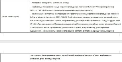 Втім, не все так погано, як здається на перший вигляд. Вказується, що співробітник на посаді третього секретаря має право на надбавку до посадового окладу за ранг та на компенсаційні виплати за перебування у довготривалому відрядженні. Проте залишається тільки здогадуватися, скільки вони складають.