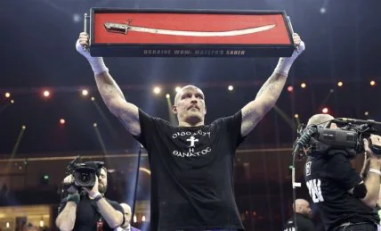 "На фото — 6 годин до бою. Олександр Усик вперше підіймає шаблю Мазепи над головою. "Я зроблю це ось так". І зробив," — підсумувала жінка. А згодом, після перемоги, Усик дивився перші новини в міжнародних медіа і казав "Уявляю, як зараз пригорає у москалів".