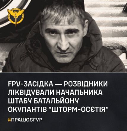 "Воїни розрахунку FPV підрозділу активних дій ГУР МО України "Кракен" ліквідували начальника штабу батальйону "Шторм.Осетія" (штурмовий підрозділ у складі 429 мотострілецького полку з Росії) та його водія", — йдеться в повідомленні.