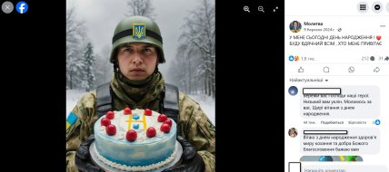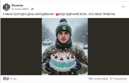 До речі, відкривши профіль чоловіка, який поширив пост про колишнього воїна ЗСУ Миколу Данилюка, я виявила на його сторінці ще одну типову приманку, яка віднедавна заполонила Інтернет. А саме, згенероване штучним інтелектом (ШІ) відео військового з напівпорожньою тарілкою в руках і підписом: "Сьогодні в мене День Народження, а ні торта, а ні квітів, і нікому привітати… одні буряки та картопля. У цей час наступного року я буду зі своєю родиною".