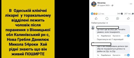Зранку відкрила стрічку Facebook, й мені одразу випало повідомлення — чорними буквами на жовтому фоні для привернення уваги — про те, що в торакальному відділенні Одеської клінічної лікарні після поранення лежить 54-річний Микола Данилюк з села Нова Гребля Калинівського району Вінницької області. І внизу — прохання до читачів поширити пост (виділено великим шрифтом): "Хай рідні знають що він живий".