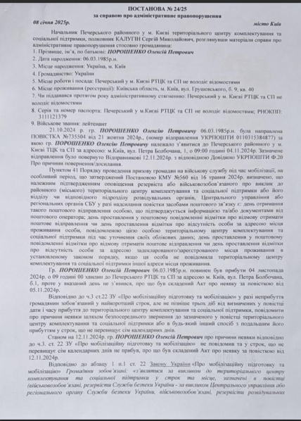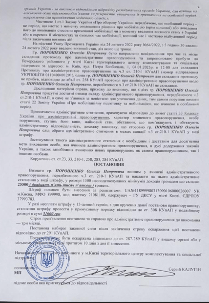 "Визнати гр. Порошенка Олексія Петровича винним у вчинені адміністративного правопорушення, передбаченого 4.3 ст. 210-1 КУпАП та накласти на нього адміністративне стягнення у виді штрафу, у розмірі 1500 неоподатковуваних мінімумів доходів громадян, що складає 25 500 грн", — йдеться у постанові начальника Печерського ТЦК та СП у м. Києві.