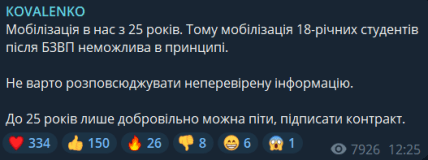 "Мобілізація 18-річних студентів після БЗВП неможлива в принципі. Не варто розповсюджувати неперевірену інформацію. До 25 років лише добровільно можна піти, підписати контракт", — зазначив Коваленко.