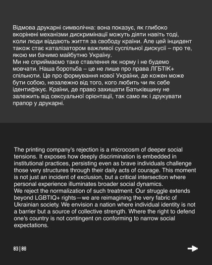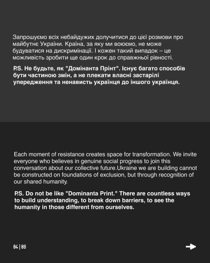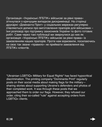 Громадська організація "Українські ЛГБТ+ військові та ветерани за рівні права" повідомила, що київська друкарня "Домінанта Текстиль" відмовилася приймати у військових замовлення. Там це обґрунтували змістом елементів символіки ЛГБТ.