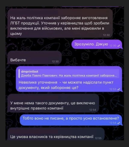 "На жаль, політика компанії забороняє виготовлення ЛГБТ продукції. Уточнив у керівництва, щоб зробили виняток для військових, але мені відмовили", — йдеться у листуванні зі співробітником друкарні.