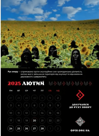 Сили спеціальних операцій Збройних сил України випустили календар-довідник на 2025 рік, який розповідає про Рух опору. Він починається не як звичайні календарі — з 1 січня, а з 24 лютого, дня, коли у 2022 році Росія почала повномасштабну війну проти України.