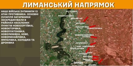 На Лиманському напрямку захисники зупинили 13 атак противника в районах Новосергіївки, Новоєгорівки, Новоплатонівки, Новолюбівки, Нового, Новомихайлівки, Ямполівки, Колодязі та Дронівки.