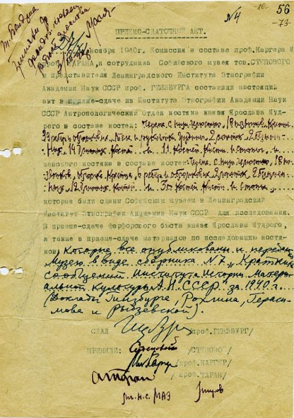 Як розповідають експерти, у 1939 році після відкриття саркофага скелет Ярослава Мудрого та невідомої жінки, яка зберігалася з ним, було передано до Ленінградського інституту етнографії та антропології. У 1940 році, згідно з актами, останки було повернуто до заповідника Софії Київської, де вони зберігалися у фондосховищах.