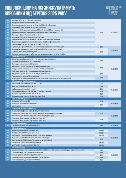 З березня 2025 року ціни на ліки в Україні знизяться. Загалом до списку увійшли близько 200 позицій: на 100 видів найпопулярніших ліків ціни знизяться на 30% вже з 1 березня, решта здешевшає з квітня на 10-50%.
