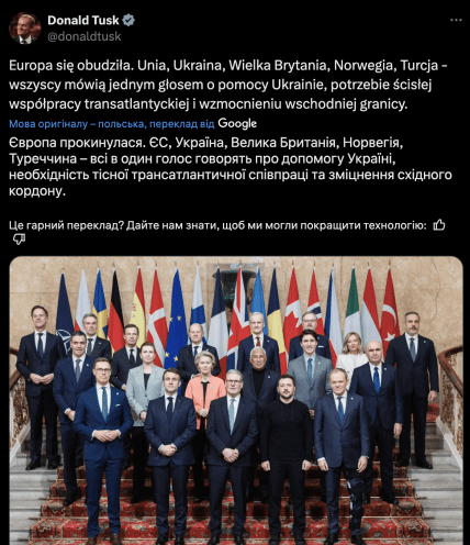 Окрім цього, прем’єр-міністр Польщі Дональд Туск каже, що Європа прокинулася і тепер в один голос говорить про підтримку України, необхідність тісної трансатлантичної співпраці та зміцнення східного кордону ЄС.