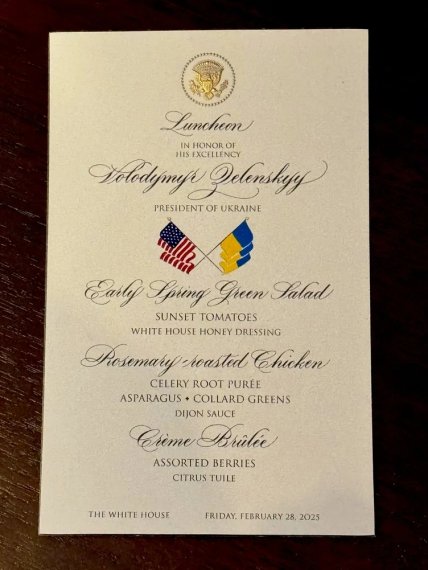 Окрім того, помічник Трампа Ден Скавіно розповів, що після того президент запросив на обід кількох додаткових членів команди. Він також поширив фото картки з меню для Зеленського. Туди увійшли салат, смажена курка й крем-брюле.
