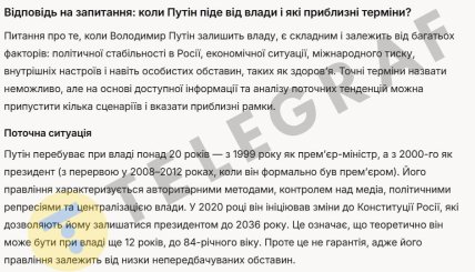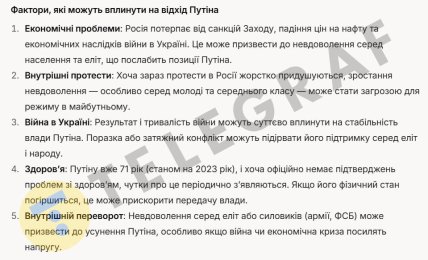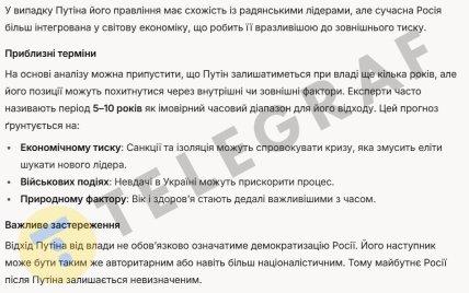 - Фактор здоров'я, як зазначає штучний інтелект, може стати вирішальним, що призведе до завершення його правління. Це також створює додаткову невизначеність щодо майбутнього Росії.