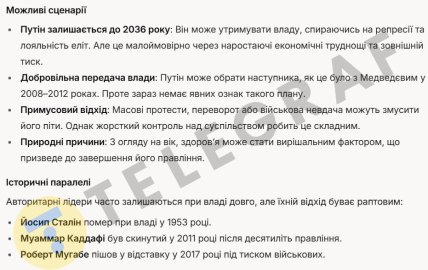 - Примусове усунення від влади: масові протести, внутрішній переворот або військова поразка внаслідок його агресії проти України можуть призвести до його усунення від влади. Нейромережа пише, що жорсткий контроль над суспільством і репресивний апарат ускладнюють реалізацію цього сценарію.