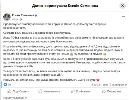 "Продовжуємо чистку авіаційного від корупції. Дякую за допомогу та співпрацю правоохоронцям", — заявила ректорка вишу.