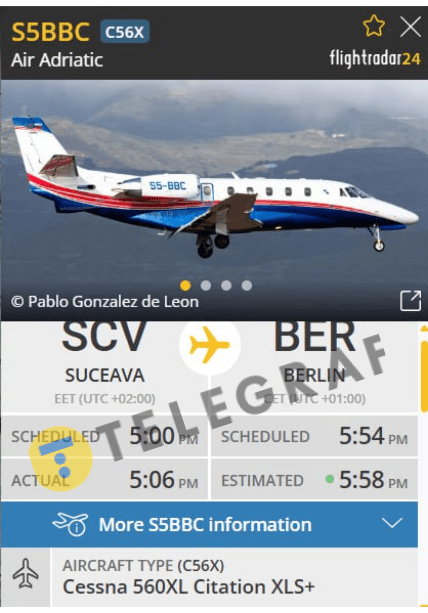 У небі над Ужгородом нібито зафіксували приватний літак. Йдеться про борт Cessna Citation XLS+ із бортовим номером S5-BBC, який виконував рейс із Сучави (Румунія) до Берліна (Німеччина).