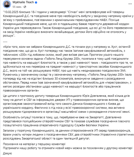 "10.02.2025 близько 18 години у месенджері "Сигнал" мені зателефонував мій товариш Комарницький Д.С. та повідомив мені про необхідність вибути у західному напрямку країни у зв'язку з проблемами, пов'язаними з кримінальним переслідуванням НАБУ. Усі дії щодо його перевезення на захід України необхідно виконати якнайшвидше, поки його офіційно не оголосять у розшук", — сказав Довгаленко.