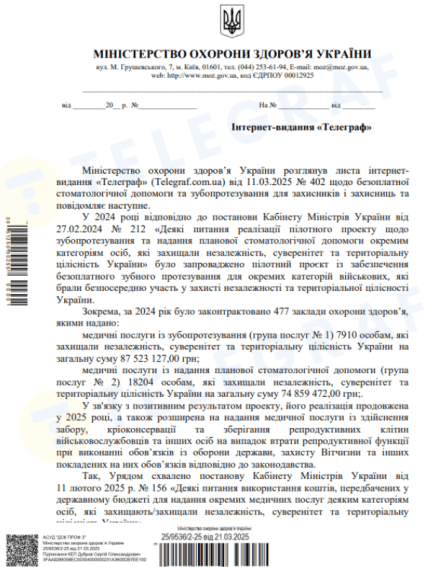 Міністерство охорони здоров’я України розповіло "Телеграфу", скільки осіб змогло скористатися програмою безкоштовних стоматологічних послуг для захисників і захисниць за 2024 рік та скільки це коштувало державі.