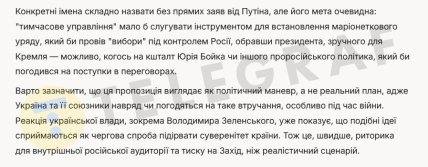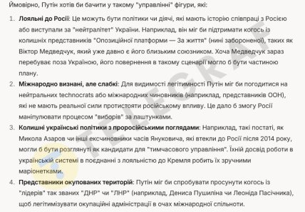 Нейромережа зазначає, що конкретні імена назвати важко, але мета Путіна очевидна — "тимчасове управління" мало б слугувати інструментом для встановлення маріонеткового уряду. За задумом Кремля, він би провів "вибори" під контролем Росії та обрав президента зручного для Путіна. Ним міг би стати, наприклад, Юрій Бойко (український проросійський політик, народний депутат України VI, VIII та IX скликань. Ексочільник депутатської групи "Платформа за життя та мир" у Верховній Раді, створеної з колишніх членів ОПЗЖ).