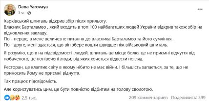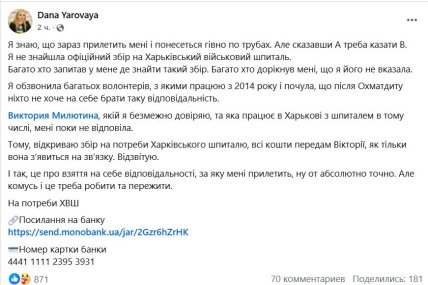 В іншому повідомленні Ярова повідомила, що відкриє збір на реконструкцію Харківського військового шпиталю. При цьому вона зазначила, що після скандалу з "Охматдитом" далеко не всі волонтери хочуть брати на себе таку відповідальність. Крім того, вона залишила реквізити у вигляді банки в monobank та номери картки 4441 1111 2395 3931