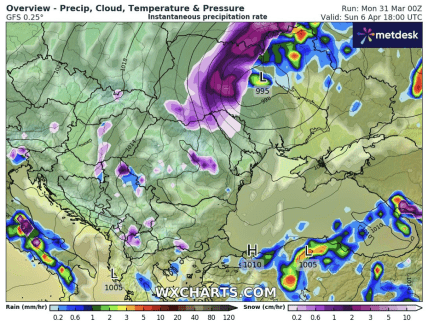 Найскладніші погодні умови очікуються 6 – 7 квітня. Циклон над центральними областями України призведе до випадання снігу, мокрого снігу у західних та північних регіонах. Місцями снігопади можуть бути сильними, а на тлі посилення північного та північно-західного вітру перетворитися на хуртовини. Лівобережжя України та південні регіони в цей час залишаться в умовах теплої повітряної маси, тому опади пройдуть у вигляді дощів, місцями можливі грози.